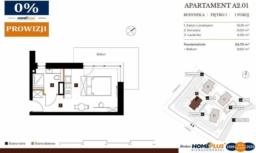 studio lub 2 pokoje (powierzchnie od 22,5 m2 do 44,5 m2). Istnieje